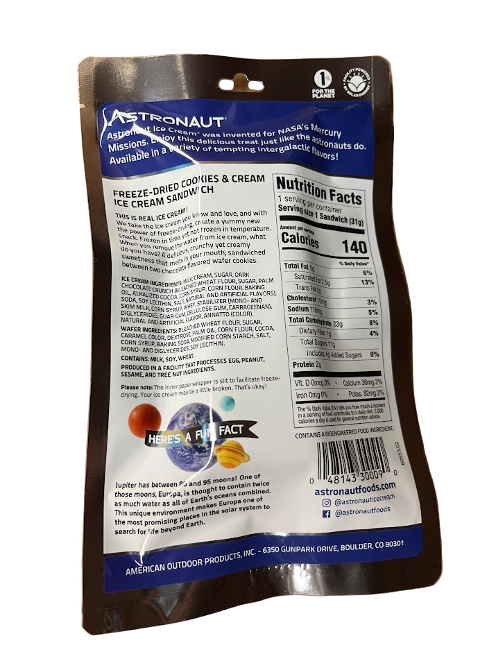 You'll love the delicious flavor and convenience of Freeze-Dried Ready to Eat Space Food from Astronaut Foods. This cookies-and-cream ice cream sandwich requires no rehydration. You get all the out-of-this-world creamy ice cream flavors with none of the mess or melting.