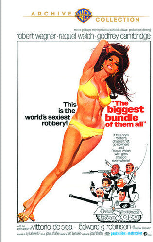 An inept criminal gang plans a daring train robbery in this hilarious Euro-comic caper starring Raquel Welch, Robert Wagner and Edward G. Robinson. When deported Chicago mobster Cesare Celli (Vittorio de Sica) is kidnapped by five amateur thieves (including Welch, Wagner and Godfrey Cambridge), he soon finds himself on the top 10 unwanted list. Considered a poor credit risk, no one will pay Cesares ransom. Down but not out, the proud mafioso persuades his none-too-bright abductors to join him in the heist of the century a great train robbery worth millions! Enlisting the aid of wily criminal mastermind The Professor (Robinson), these unlikely conspirators risk life and limb in a mad scramble to gain the ultimate prize - $5 million in platinum ingots. Shot on gorgeous locations in Italy and France, The BiggestBund1e of Them Allis an imaginative, outrageous romp, a hilarious midadventure (Hollywood Citizen-News) that guarantees the biggest laughs of them all!