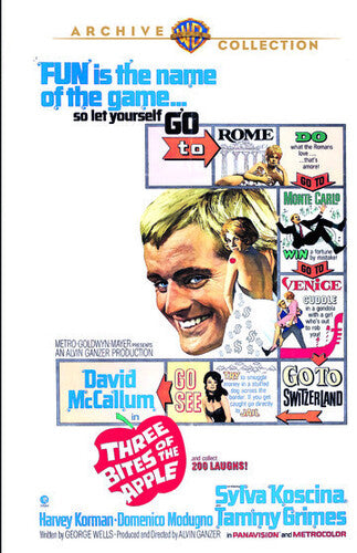 A mild-mannered Englishman leading a bus tour across Italy, Stanley Thrumm (David McCallum), wins a fortune at a Riviera casino, making him a target for Carla Moretti (Sylva Koscina), a beautiful adventuress. Convincing he love-struck Stanley to invest his winnings in Switzerland to avoid paying British taxes, Carla persuades him to hand over the cash to her partner in crime (Domenico Modugno), who promptly absconds with the loot. Realizing he's been swindled, Stanley embarks on a madcap chase to catch the sexy temptress who stole his money along with his heart. Also starring Tammy Grimes and Harvey Korman, Three Bites of the Apple was David McCallum's first leading role and features the catchy theme song "In the Garden - Under the Tree," co-written and performed by the actor himself.