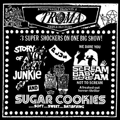 Double vinyl LP pressing. Troma Triple Feature: Three film soundtracks on 2lp vinyl, featuring the film scores from - Story of a junkie (1985), Scream Baby Scream (1969), Sugar Cookies (1973). All music for this compilation release was sourced from audio licensed from Troma Entertainment. Includes double sided insert. Limited to 250. Troma Triple Feature Soundtrack was made to bring that gritty 42nd Street grindhouse vibe straight to your speakers. All the sleaze and chaos of 1980's NYC safely contained on Vinyl!
