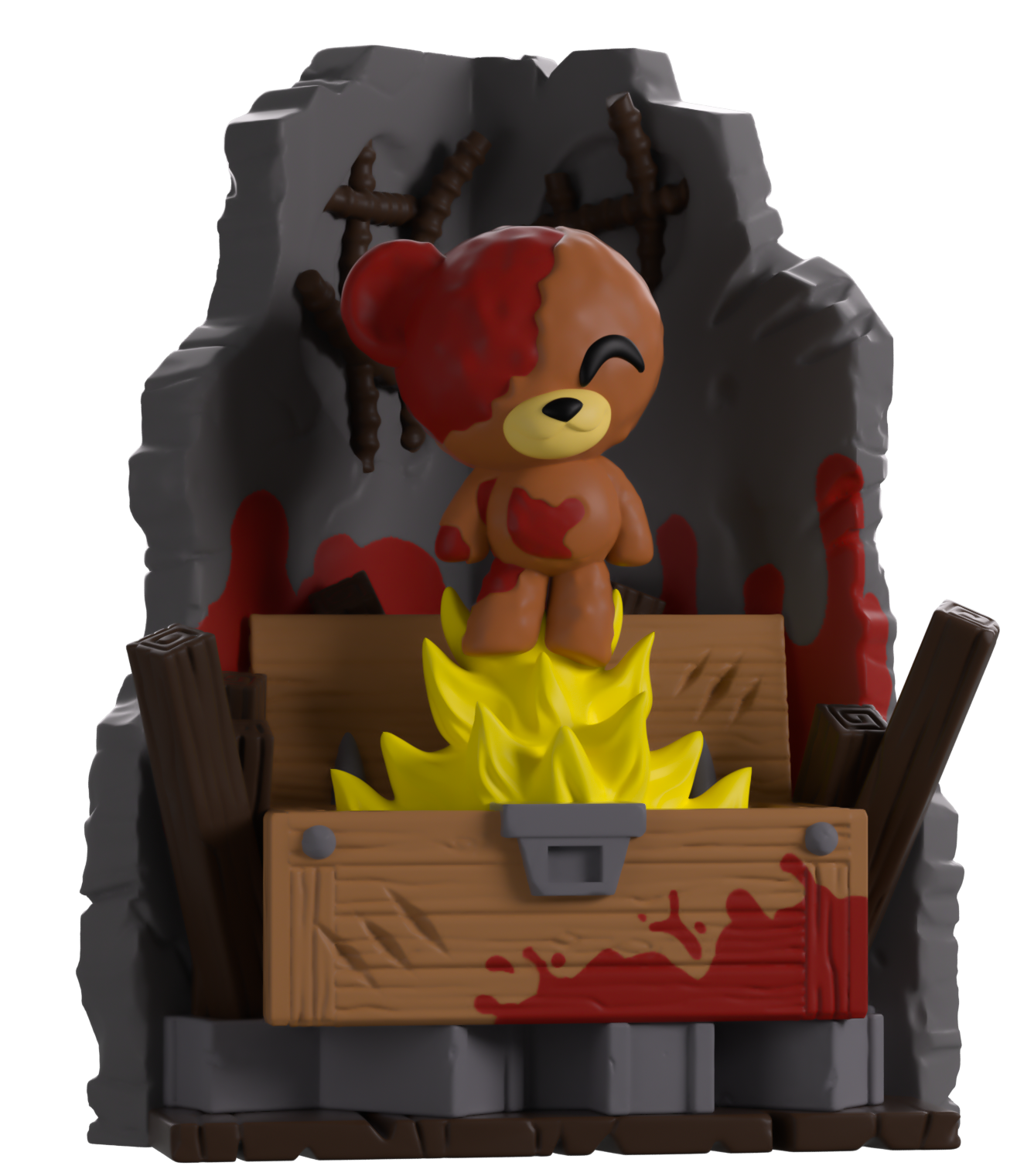 Test your luck and see what your reward is! Just be careful, it may not be as helpful as you need! At 4.9 inches tall and set against a backdrop of cold grey cement with exposed metal rebar, large chunks gouged out, and wooden planks strewn to the sides. The blood-spattered Mystery Box has been flung open as yellow flames emerge from its depths to reveal your ‘prize’, a blood-soaked brown Teddy Bear with a missing ear. But that’s not all as this figure has a 1 in 6 chance for a Chase version which replaces the Teddy with a powerful raygun! So, it's time to track down the box’s next location and test your luck! The exterior of the packaging shows a closed Mystery Box in a dimly lit bloody room, while the interior is pitch black covered in a vibrant red blood spray. The protective sleeve sees a beaten-up wood panelling with red notches marked in it as the figure can be seen through the large clear window at the packaging’s front. This collectible ships in a matte, embossed, protective outer sleeve and a custom-sized plastic protector for maximum protection during shipping.